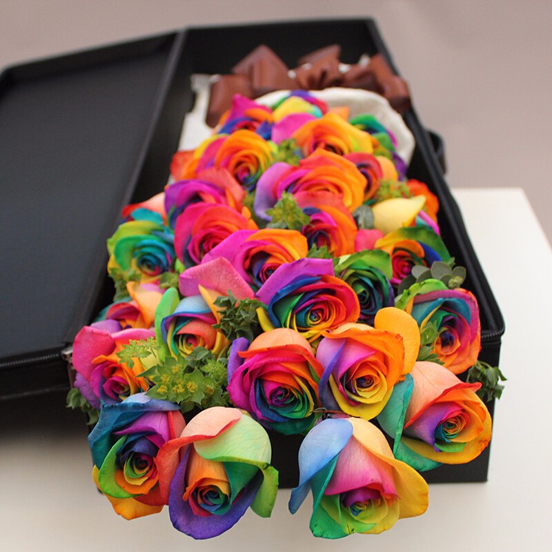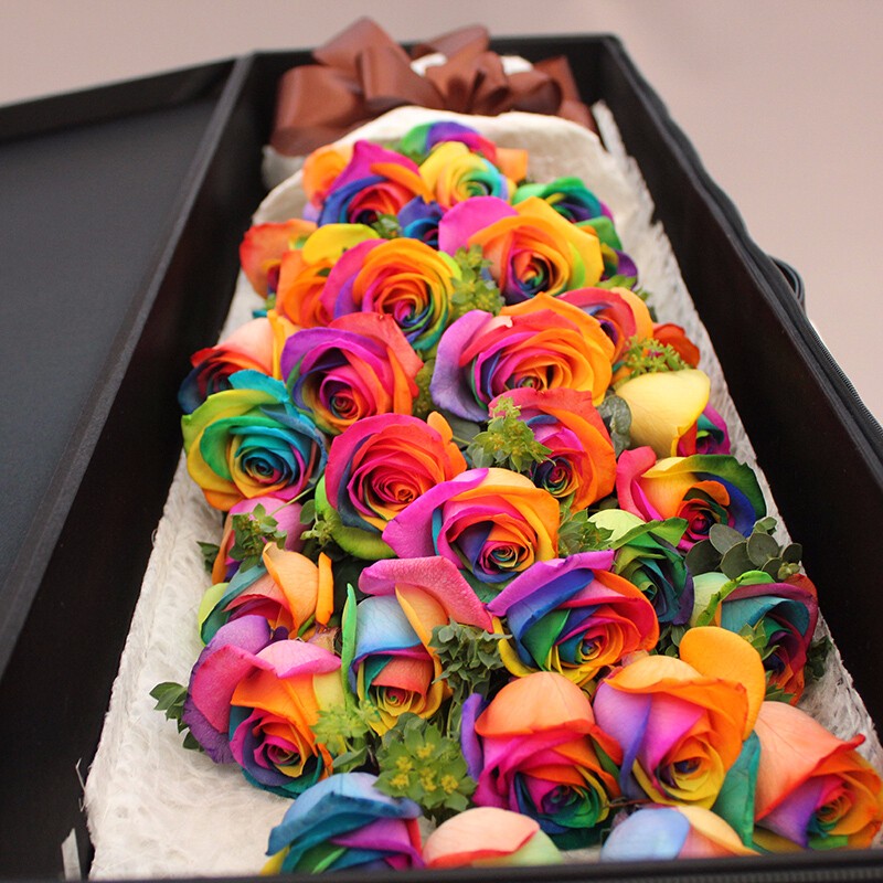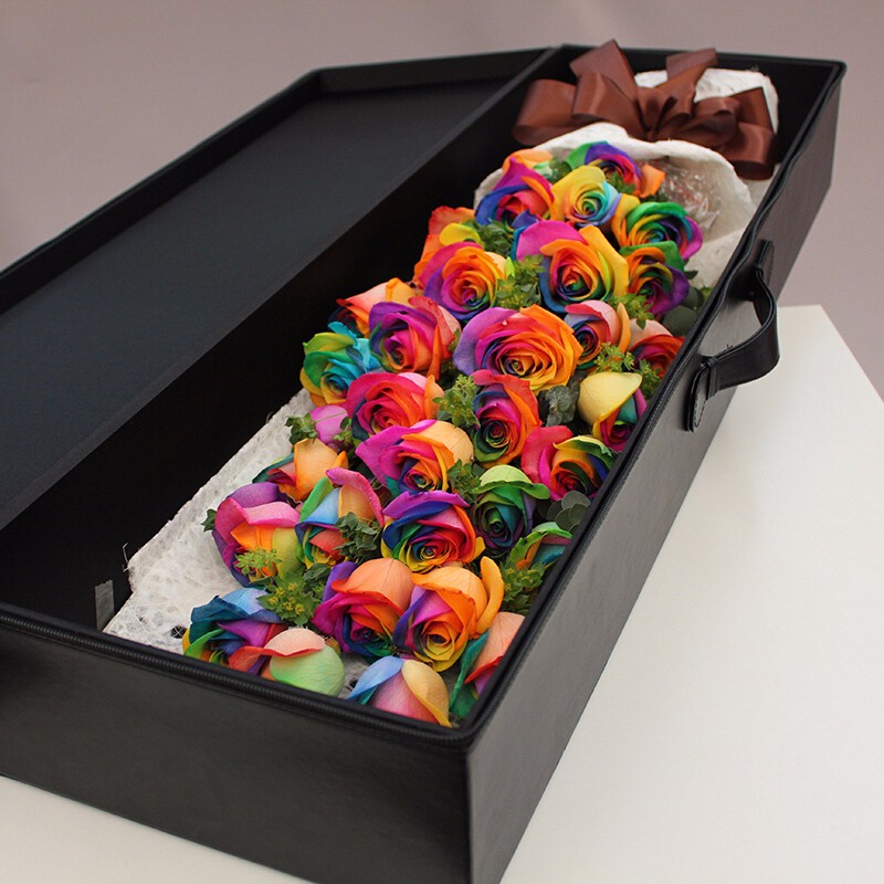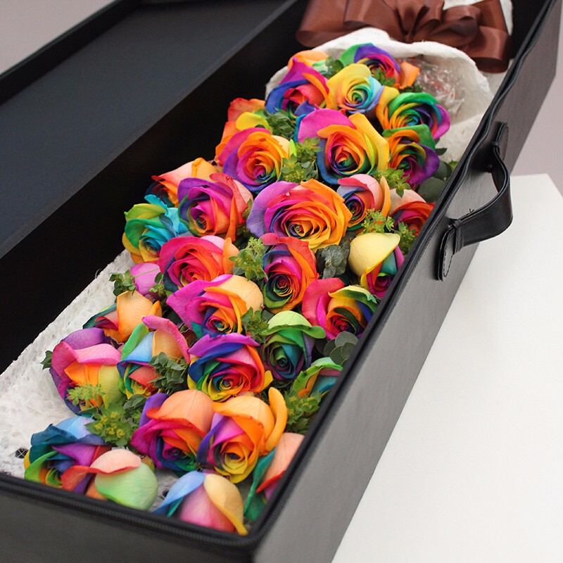 花材: 精选36朵进口厄瓜多尔七彩玫瑰花,叶上黄金点缀。