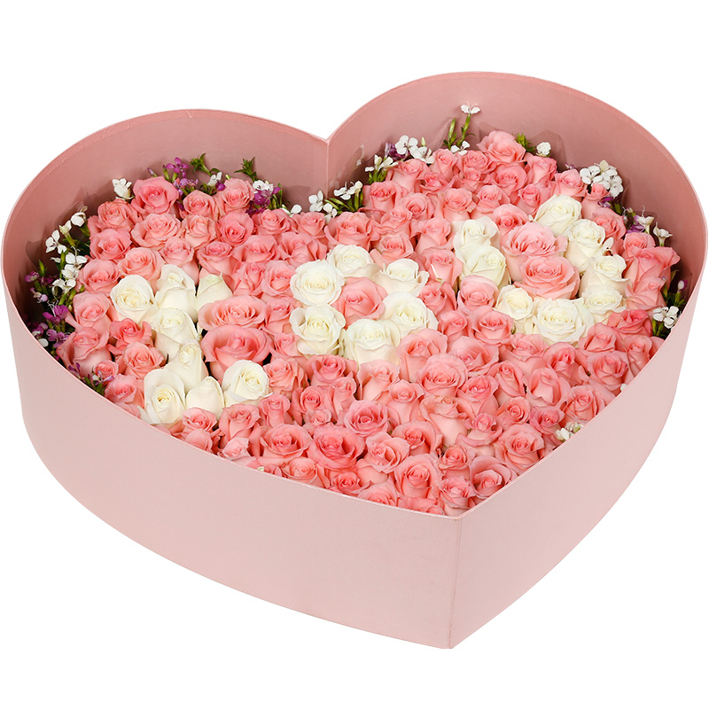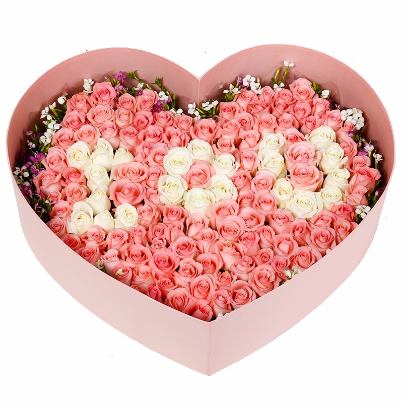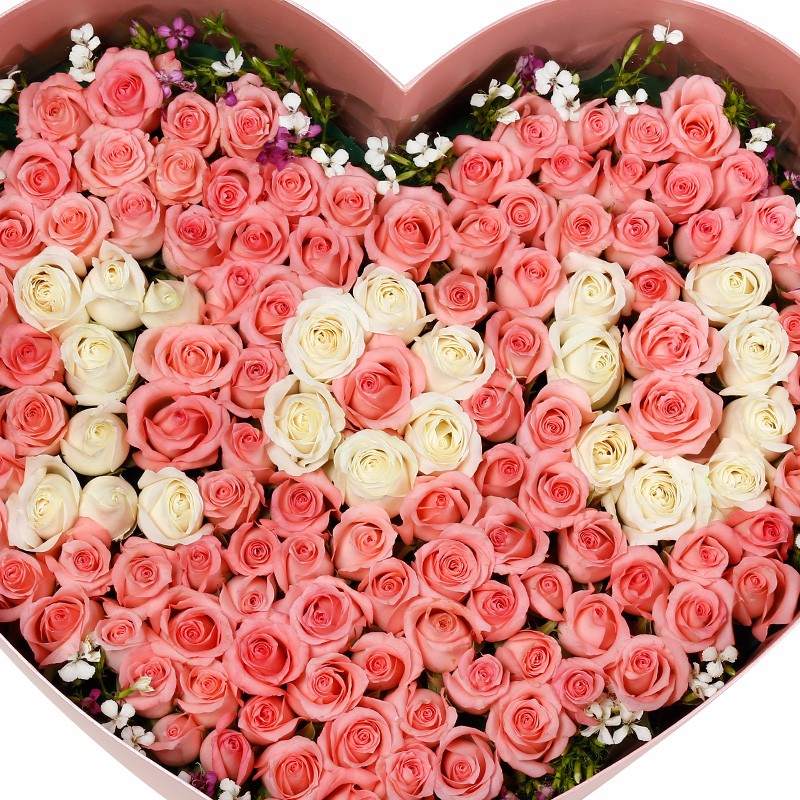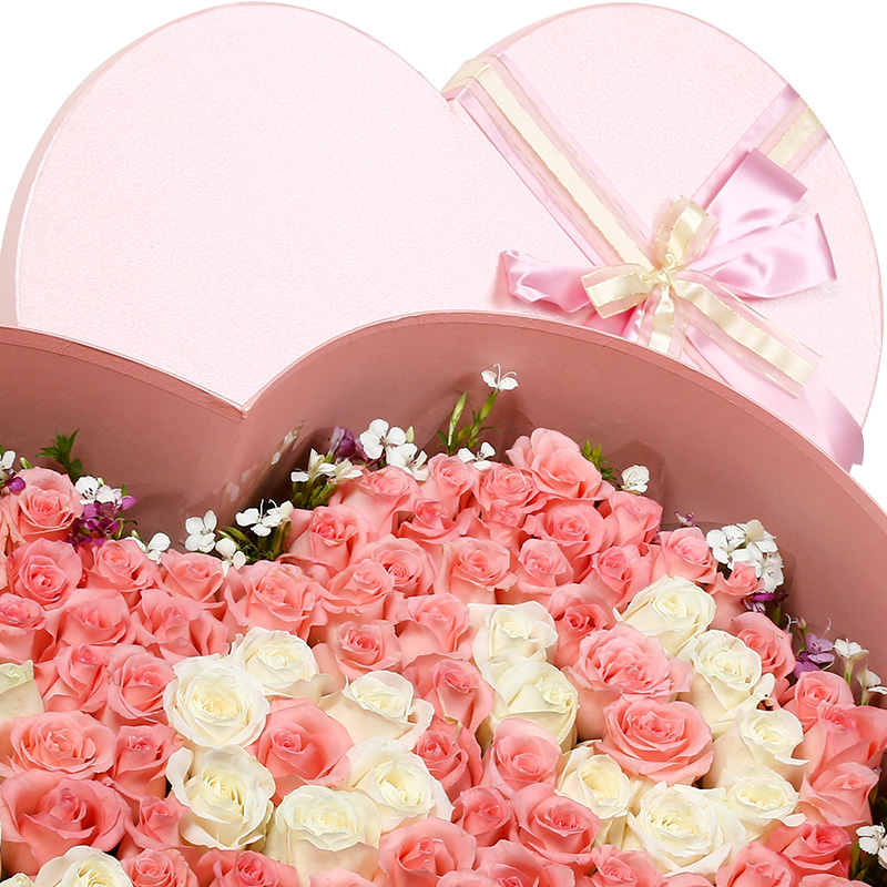花材: 99支精品混色玫瑰(白玫瑰、粉玫瑰),搭配适量粉色石竹梅。