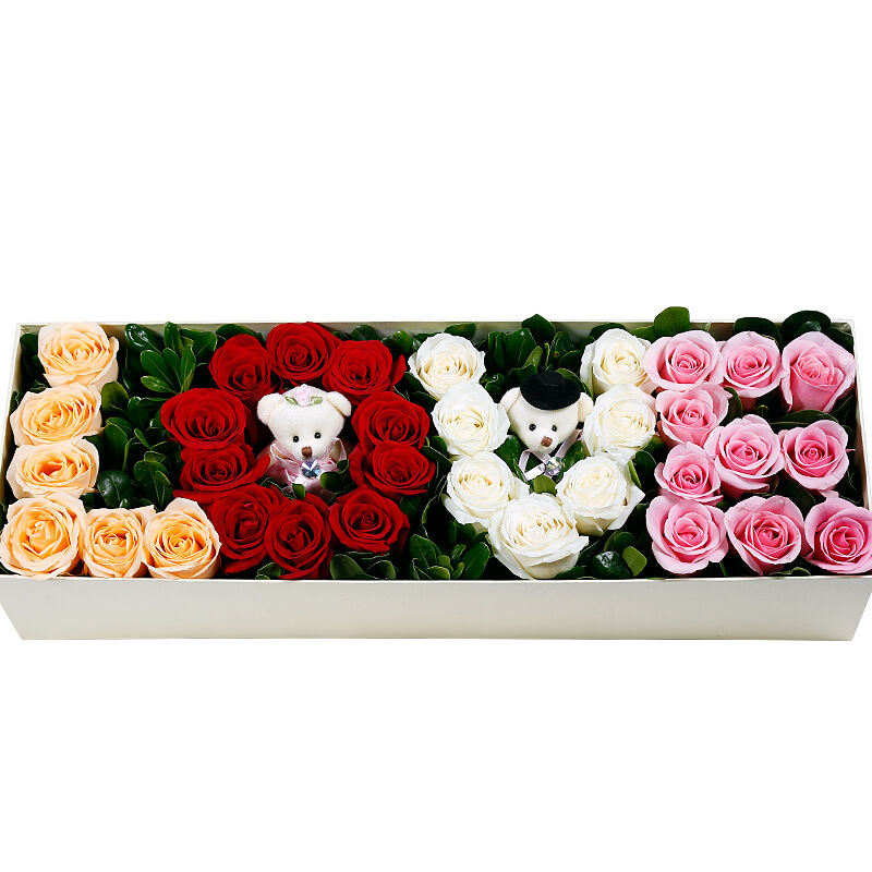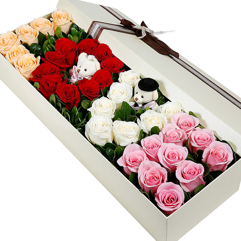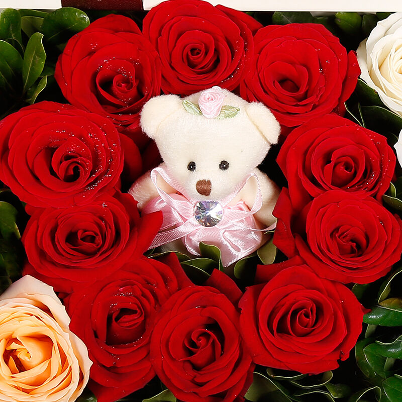 花材: 33支混色玫瑰拼成“LOVE”形状+2支可爱小熊(6支香槟玫瑰+10支红玫瑰+7支白玫瑰+10支粉玫瑰),搭配适量绿叶。