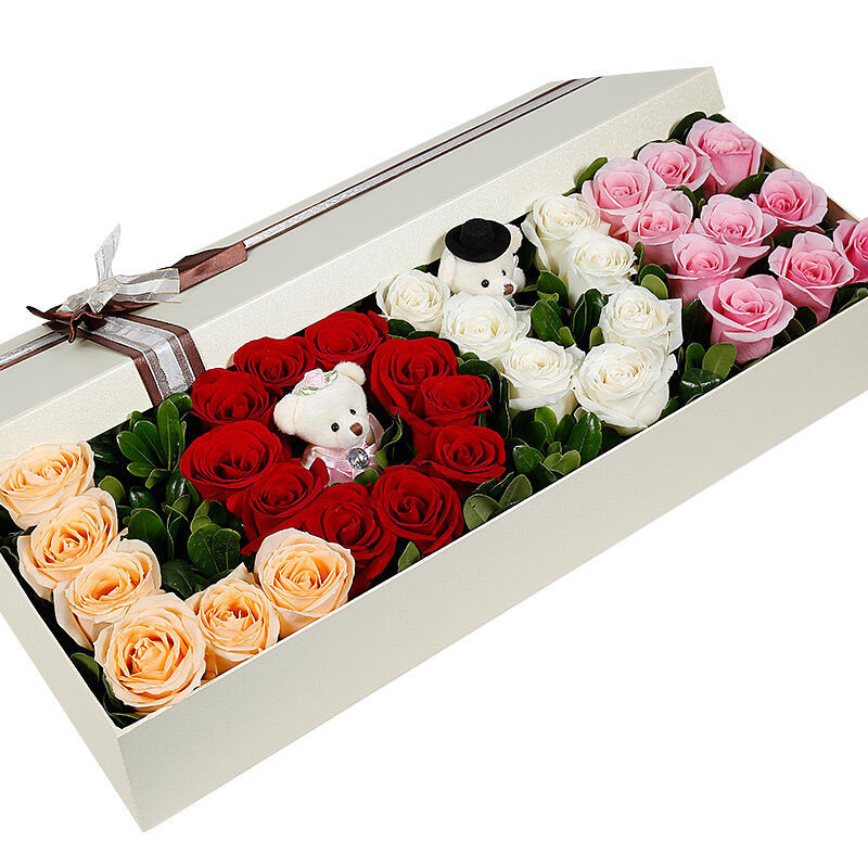 花 材:33支混色玫瑰拼成“LOVE”形状+2支可爱小熊(6支香槟玫瑰+10支红玫瑰+7支白玫瑰+10支粉玫瑰),搭配适量绿叶。