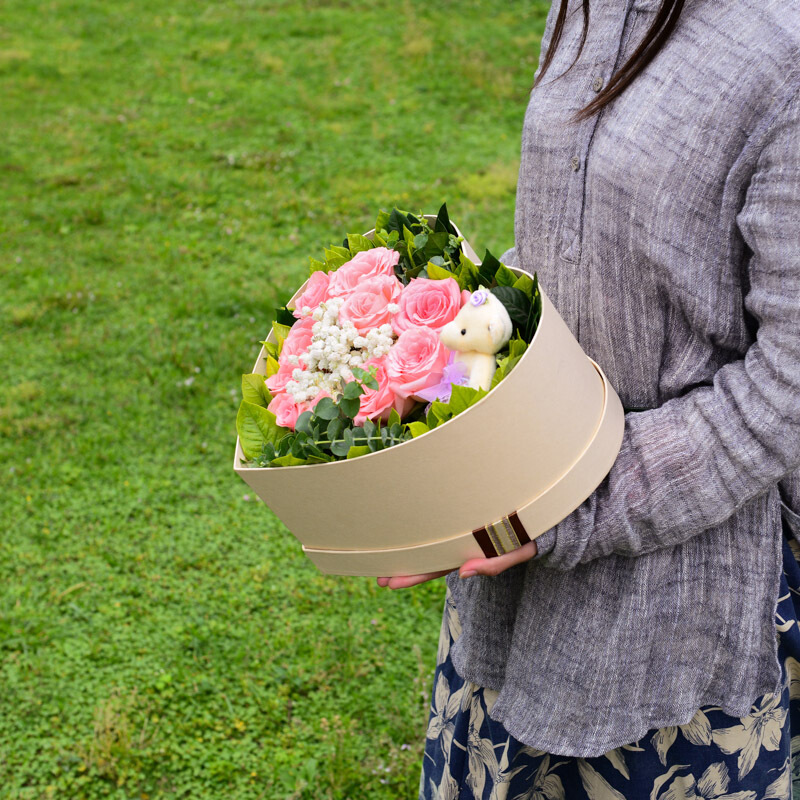 花 材:10支精品粉玫瑰+2只可爱小熊,搭配适量白色满天星、尤加利、栀子叶。
