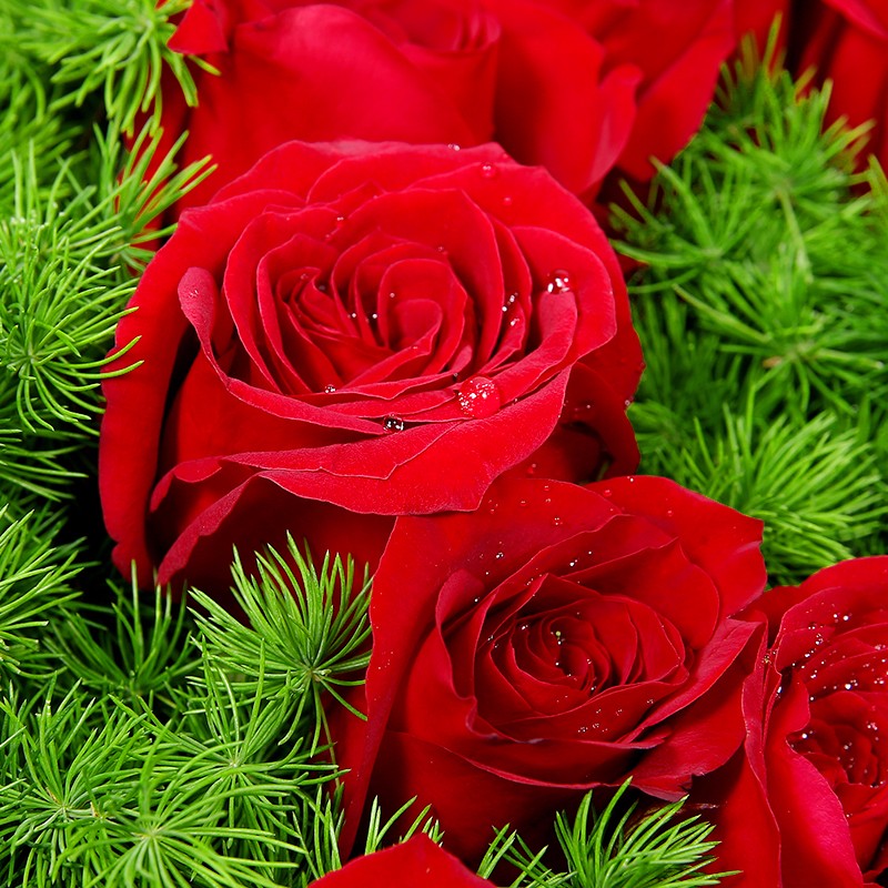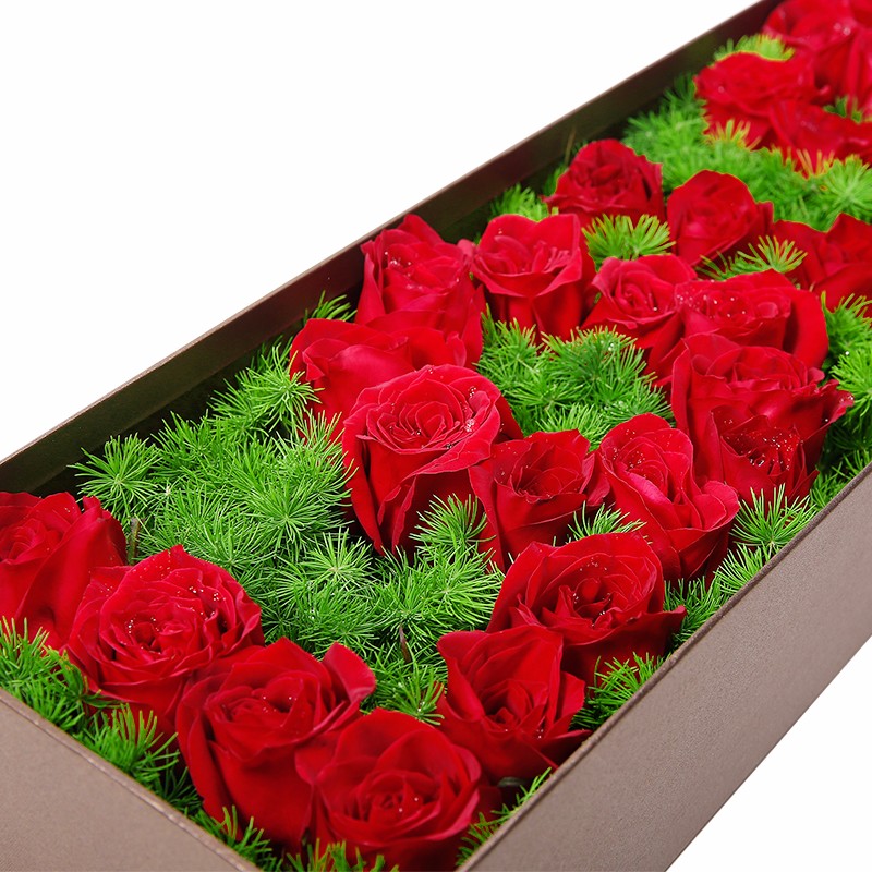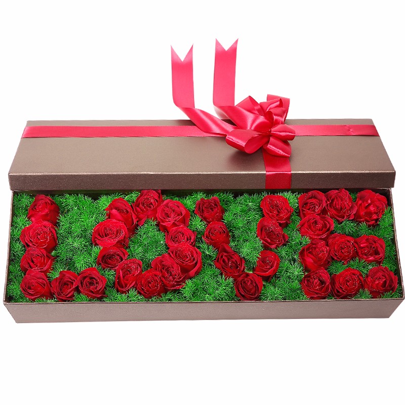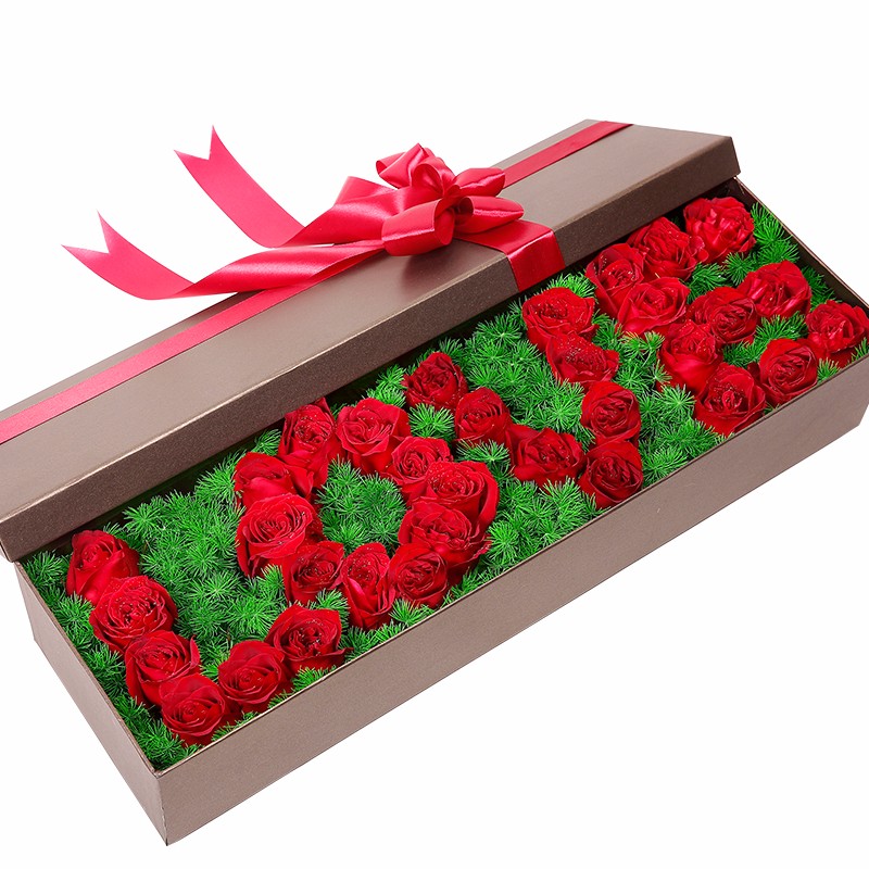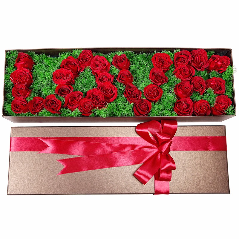花 材:33支精品红玫瑰,搭配天冬门打底(若天冬门断货则用其他同效果配草替换)。