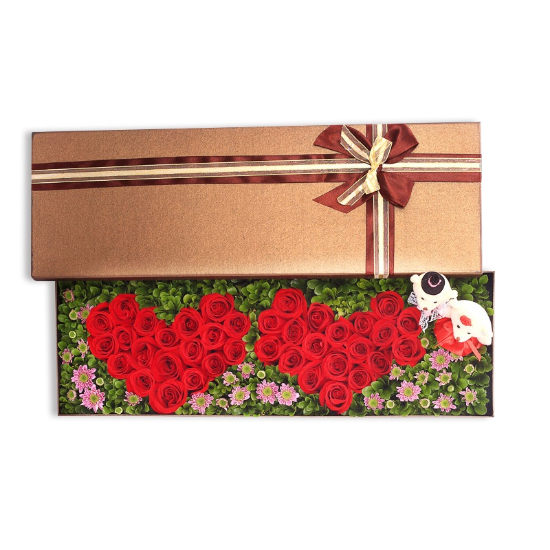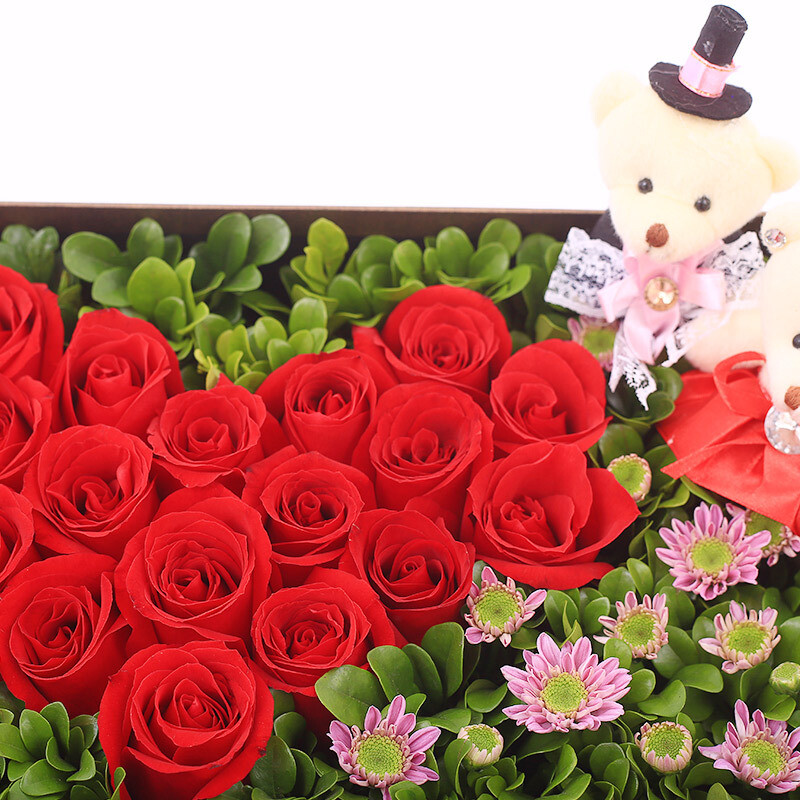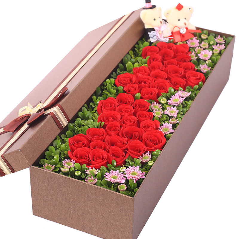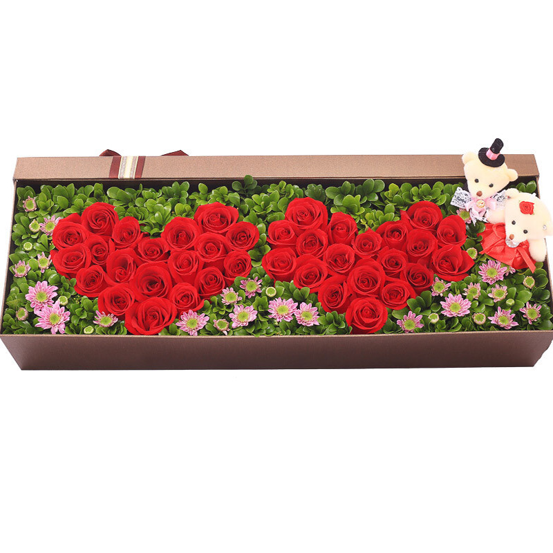 花 材:2个红玫瑰爱心拼图,每个爱心19支红玫瑰(共38朵),2支可爱小熊,搭配绿叶、粉色小雏菊装饰。