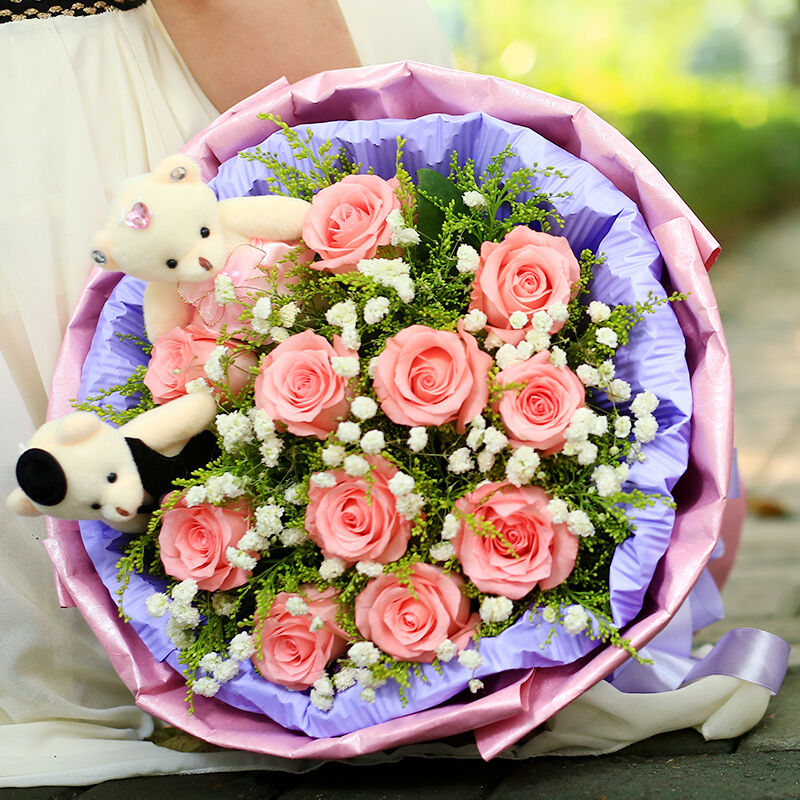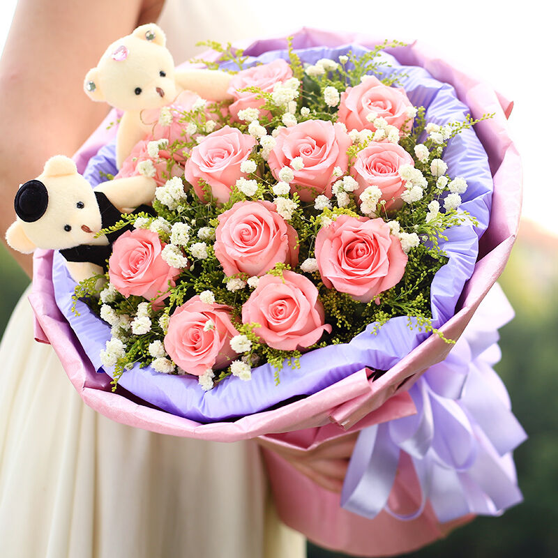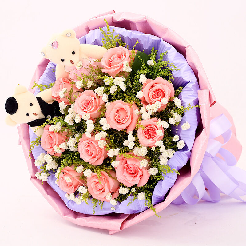 花材: 11支精品粉玫瑰,搭配黄莺、满天星,2只可爱小熊。