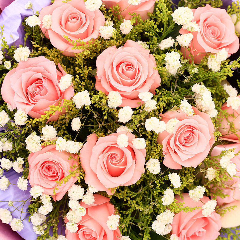 花 材:11支精品粉玫瑰,搭配黄莺、满天星,2只可爱小熊。