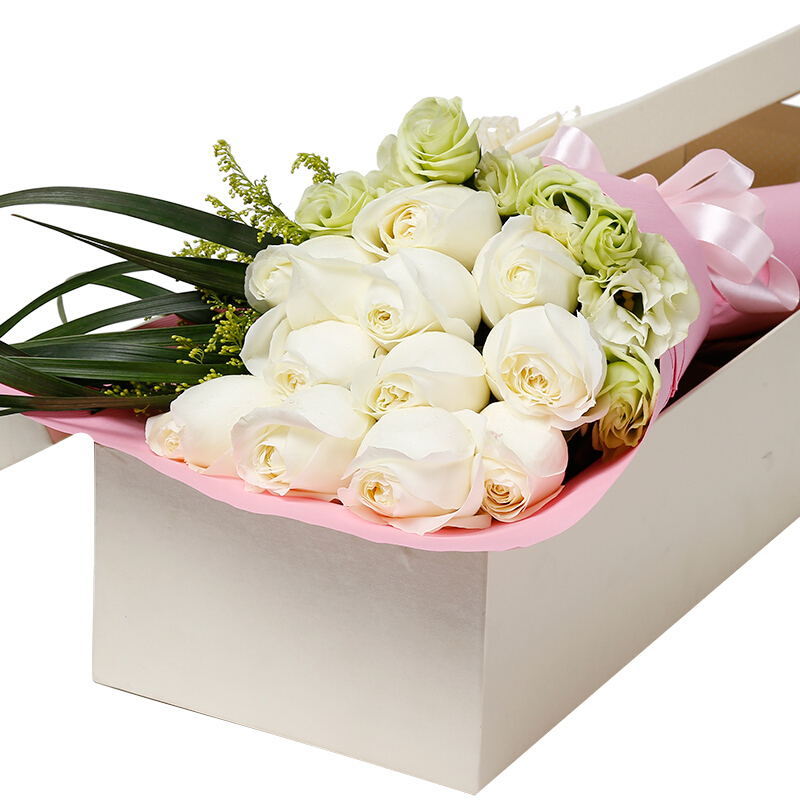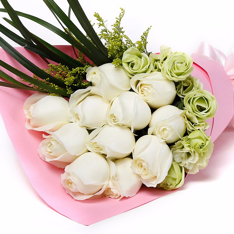 花材: 11支精品白玫瑰,搭配浅绿色洋桔梗、书带草、黄莺。