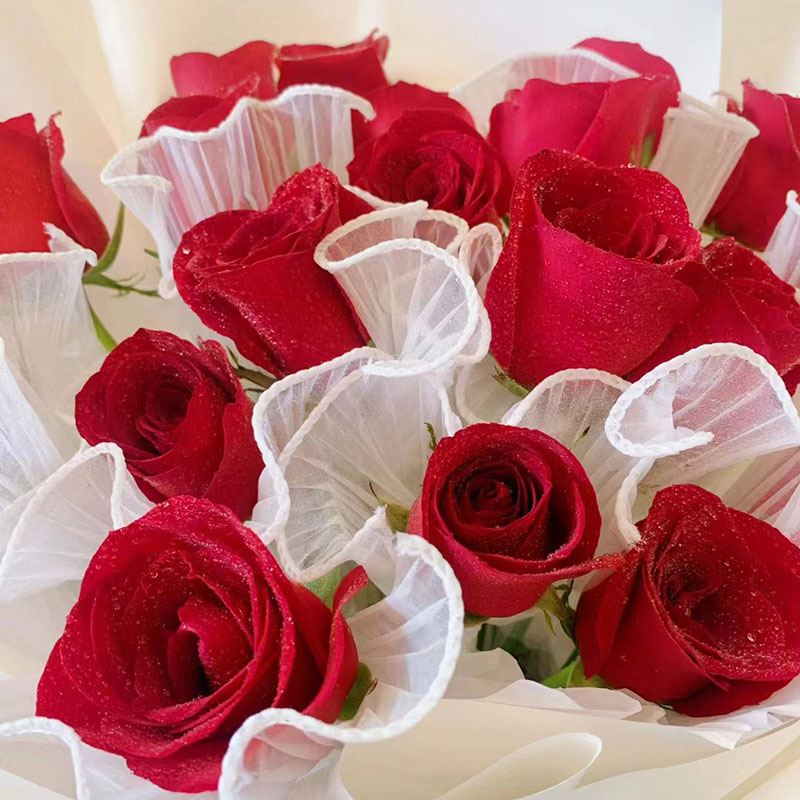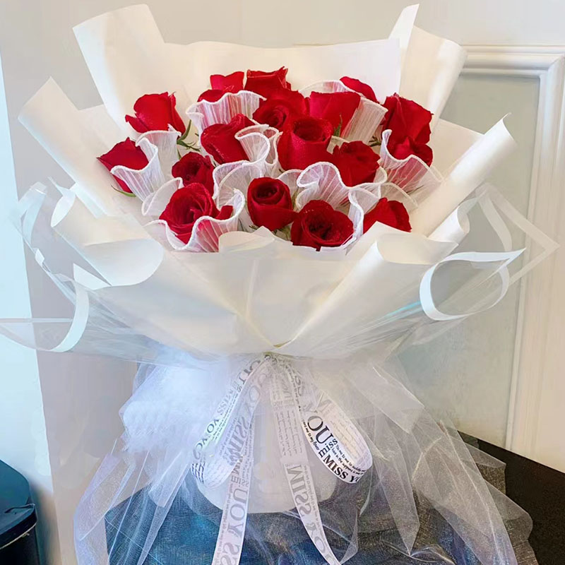 包 装:白色欧雅纸最里层造型,玻璃纸中间层,最外层白色网纱。同色系花结。