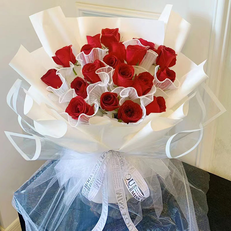 包装: 白色欧雅纸最里层造型,玻璃纸中间层,最外层白色网纱。同色系花结。