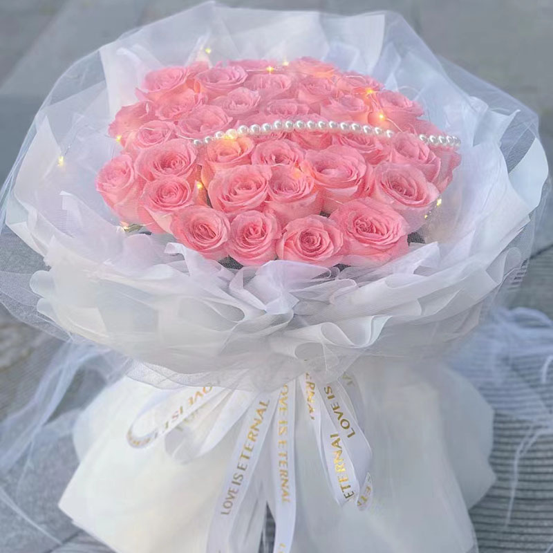 花材: 精选33朵粉玫瑰,1条灯串,1条珠串装饰花面。