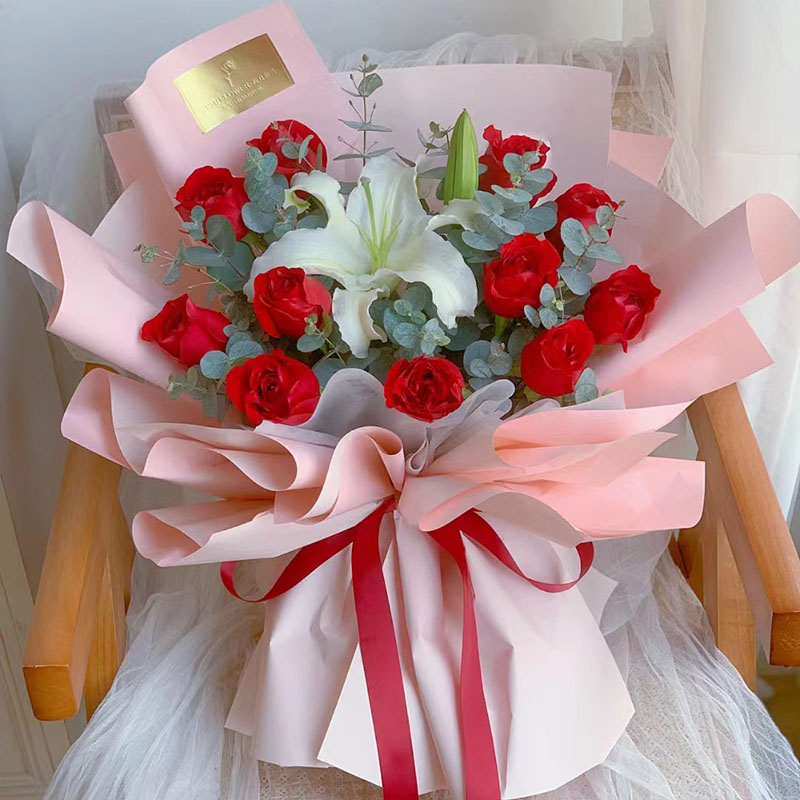 花材: 11朵红玫瑰,1支多头白色香水百合,搭配尤加利叶装饰。