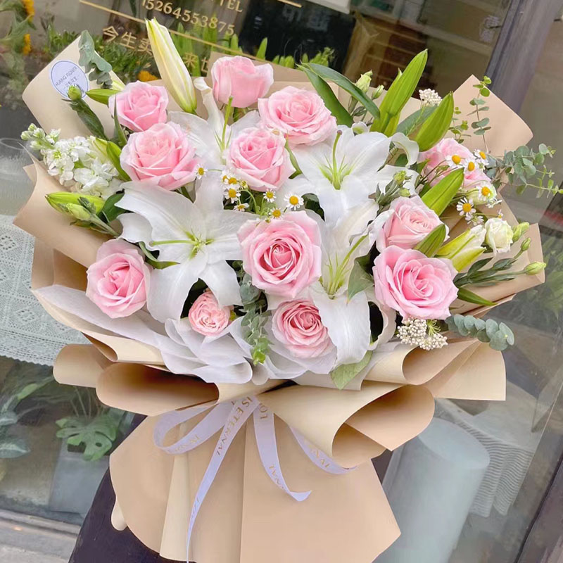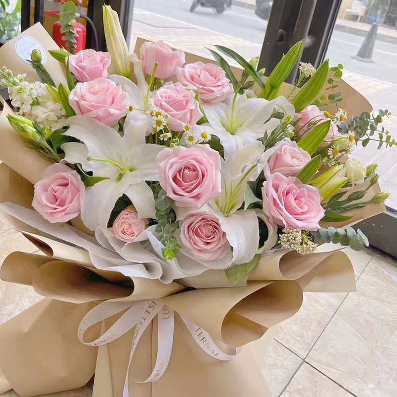 花材: 11朵粉玫瑰,4支多头白色香水百合,搭配尤加利叶、洋桔梗、洋甘菊装饰。