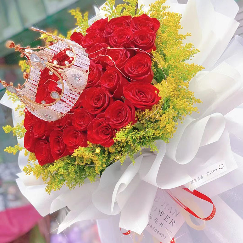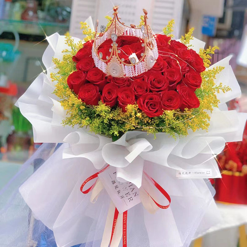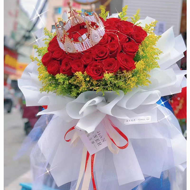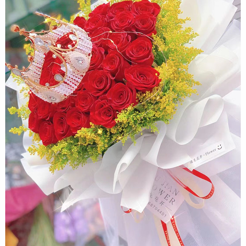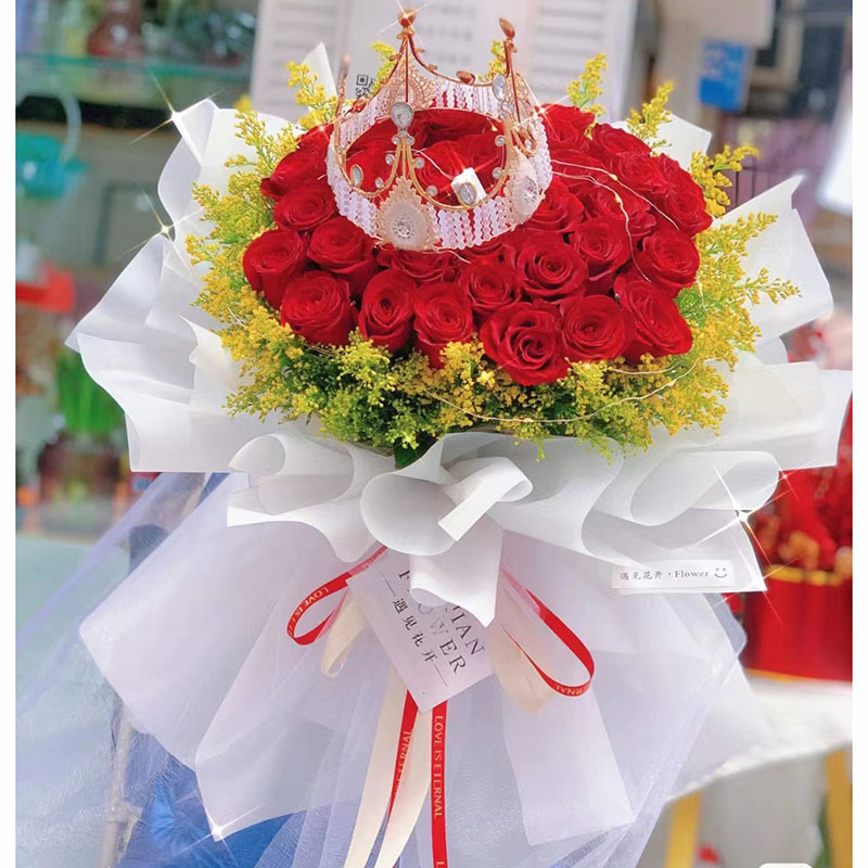花材: 33朵红玫瑰,1条灯串,1个皇冠(款式随机),搭配黄莺草外围环绕装饰。
