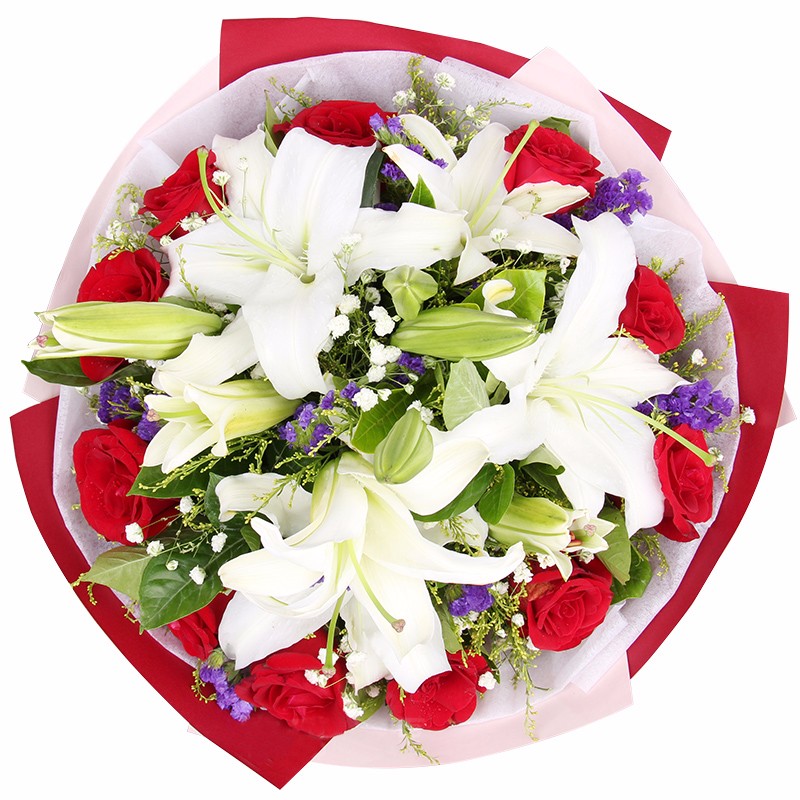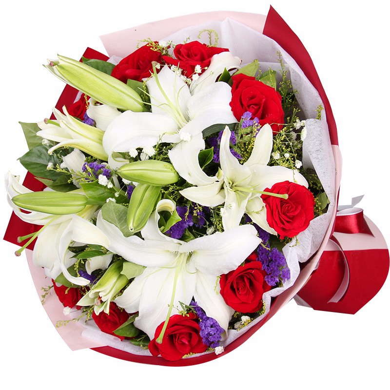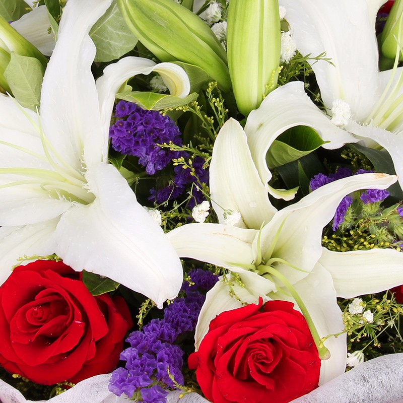 花 材:11支精品红玫瑰+3支多头白百合,搭配适量紫色勿忘我、白色满天星、黄莺草、栀子叶。