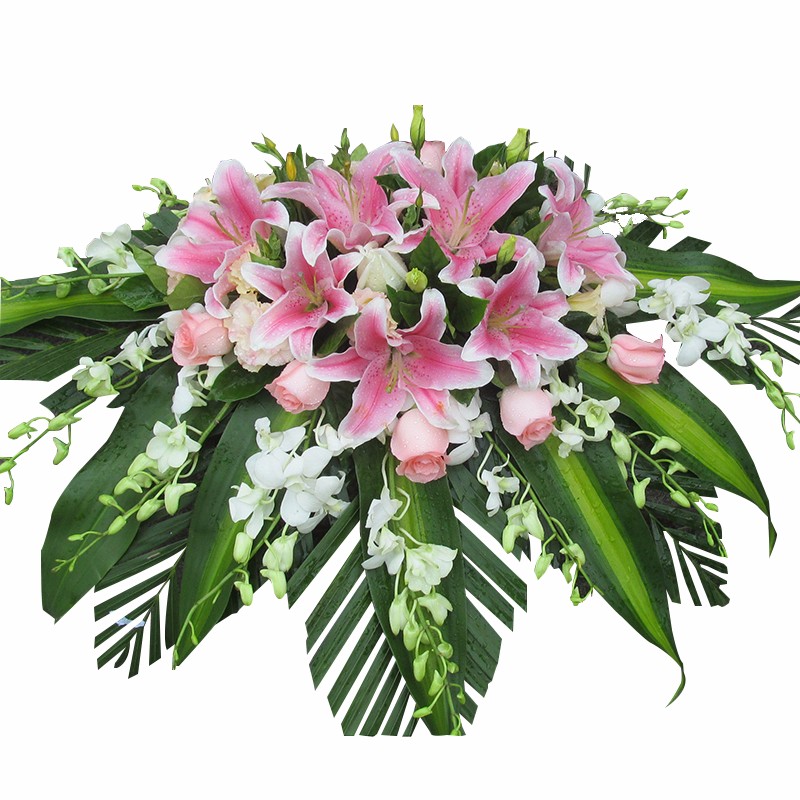 包 装:8朵粉百合、6支粉玫瑰,搭配散尾葵、巴西叶、栀子叶、粉色洋桔梗、白色洋兰。