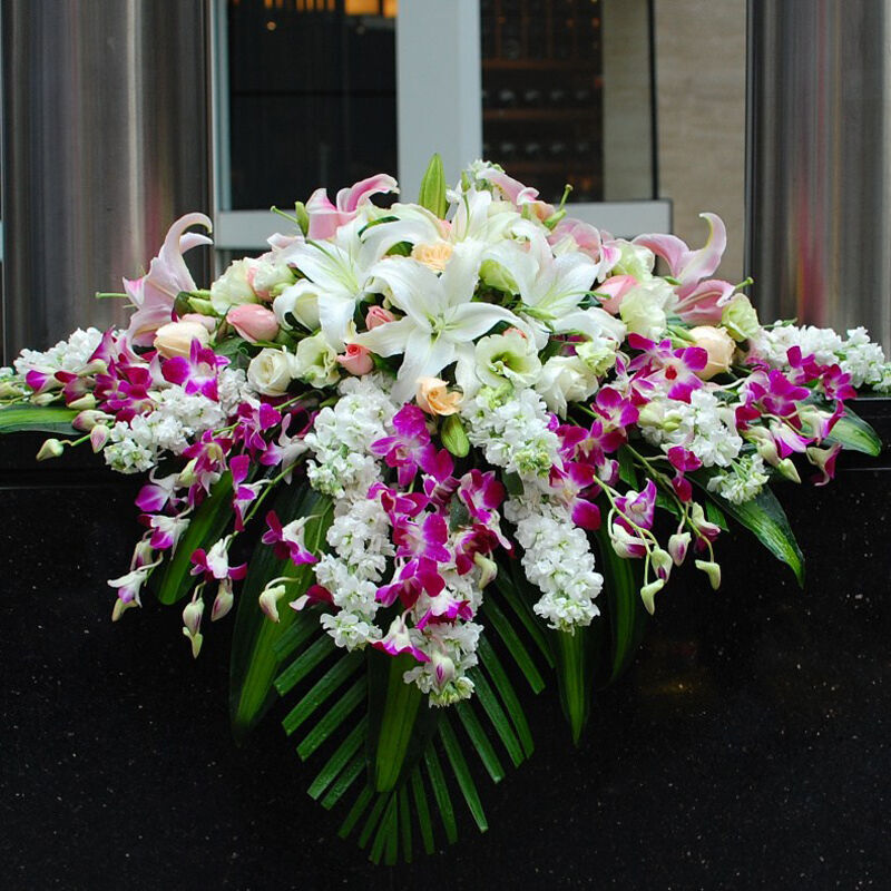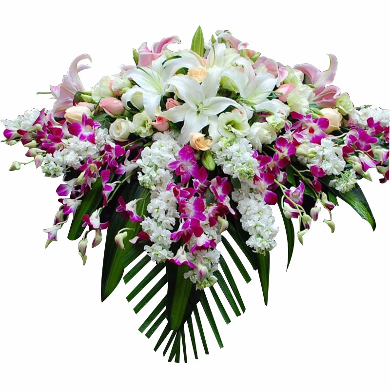 包 装:材料 2支多头白百合、2支多头粉百合、9支粉玫瑰、6支香槟玫瑰、6支白玫瑰、5支浅绿色洋桔梗,搭配适量白色金鱼草、洋兰、散尾葵、巴西叶。