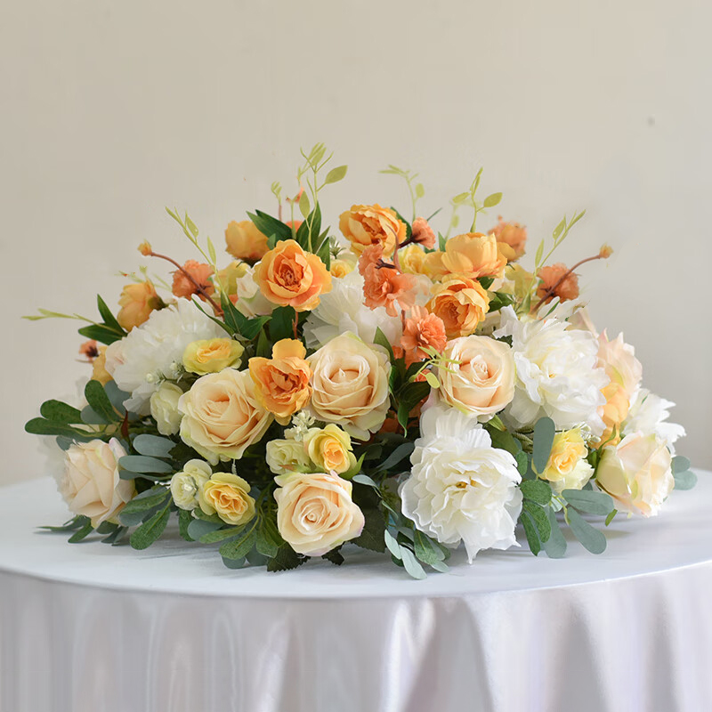 包装: 14朵香槟玫瑰,6朵白色洋牡丹,3枝多头橙色洋桔梗,3枝多头橙色康乃馨、绿色洋桔梗、尤加利叶点缀