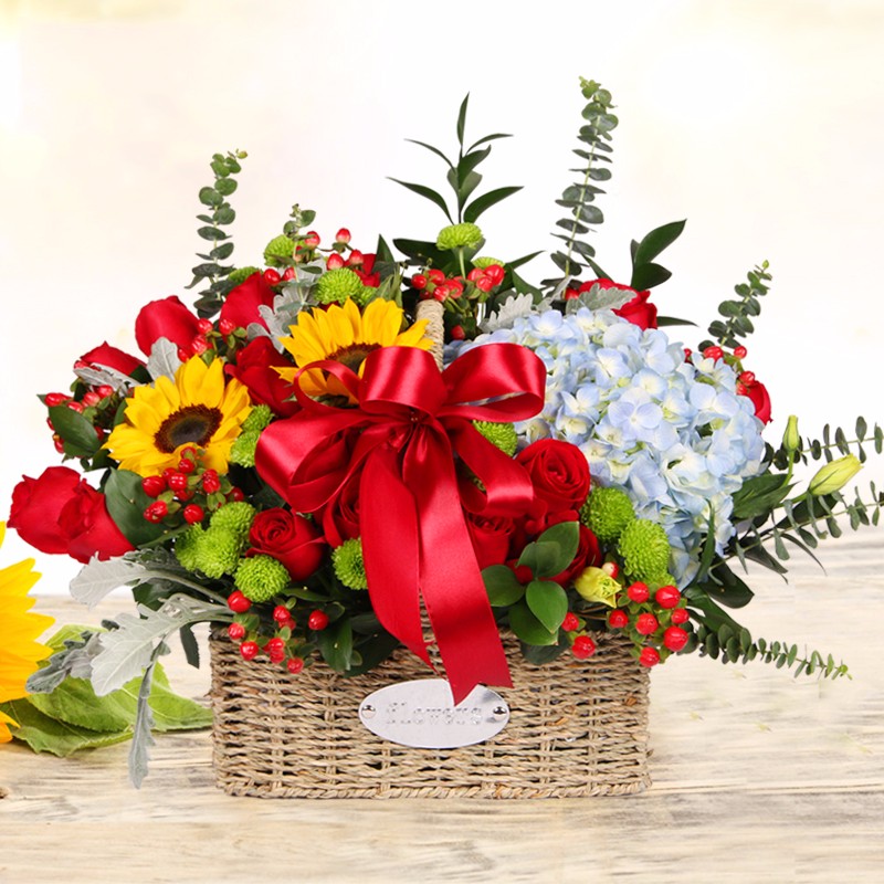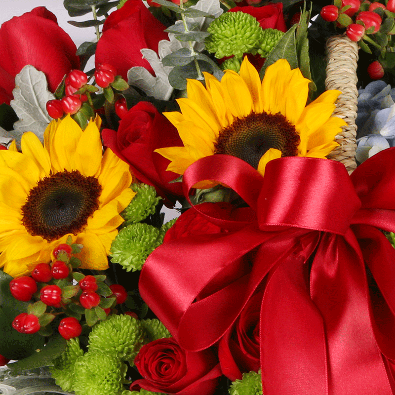 花 材:19支精品红玫瑰、2支向日葵、1支蓝色绣球,搭配1支浅绿色洋桔梗、绿色小雏菊、红豆、尤加利、栀子叶。