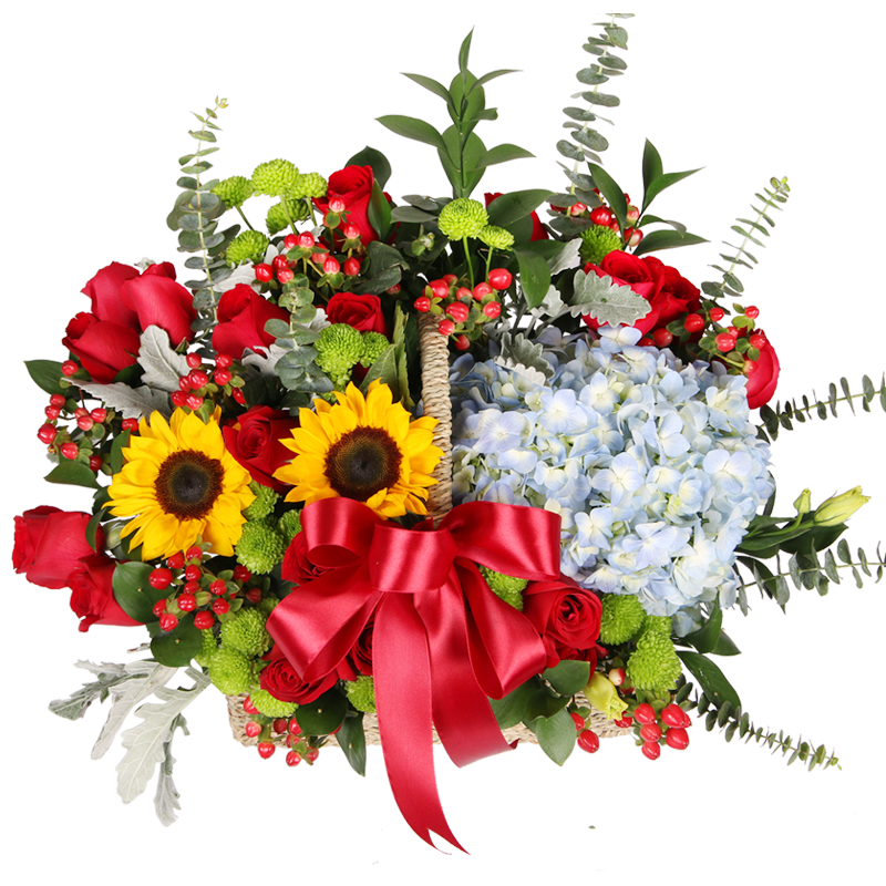 花材: 19支精品红玫瑰、2支向日葵、1支蓝色绣球,搭配1支浅绿色洋桔梗、绿色小雏菊、红豆、尤加利、栀子叶。