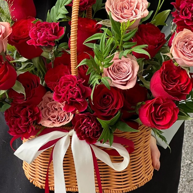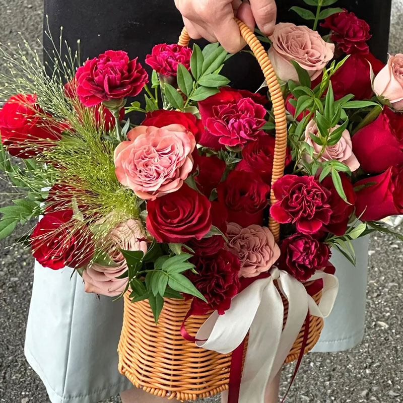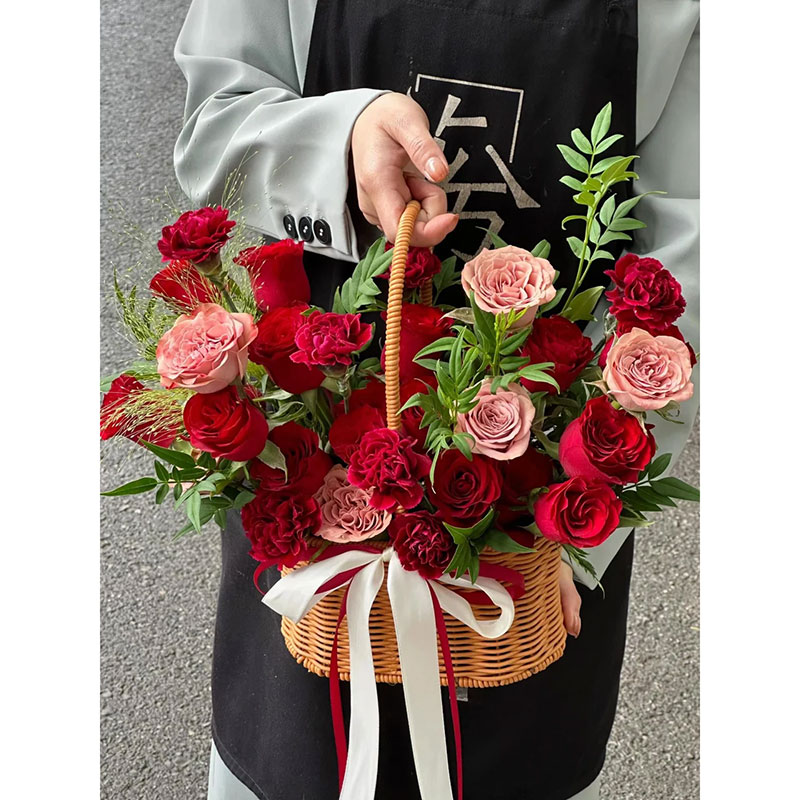 包装: 精美手提花篮,提手处用红色、香槟色丝带系蝴蝶结装饰。(篮子和配饰等具体以当地实物为准)
