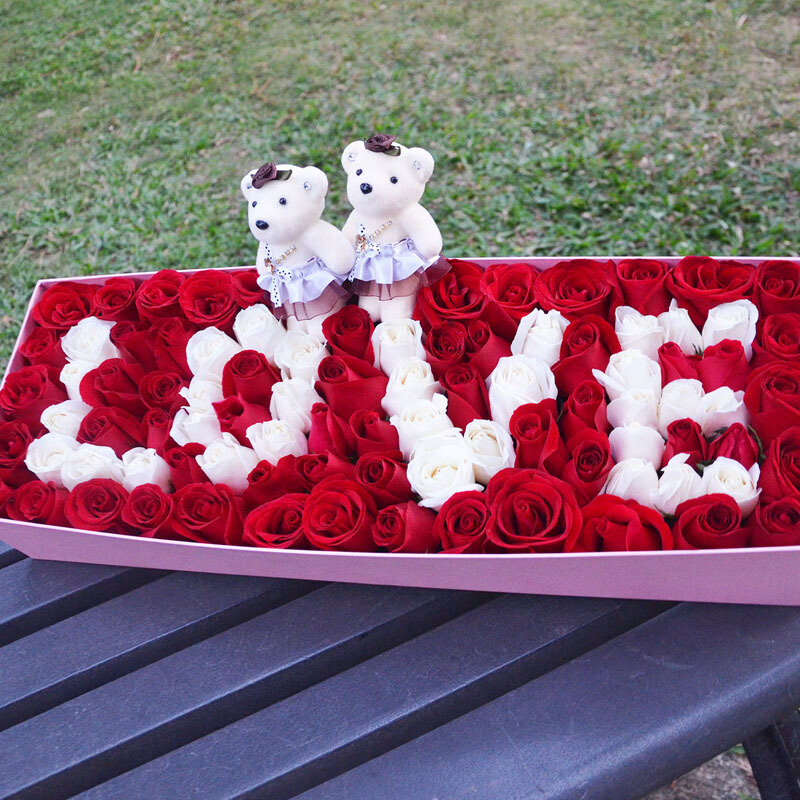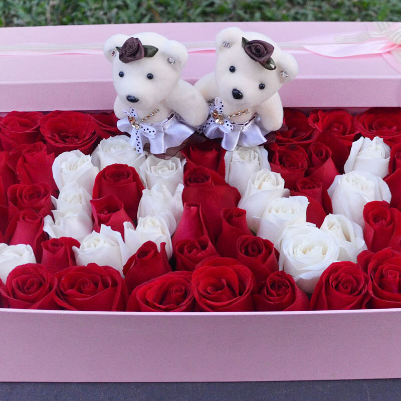 花材: 99枝(红玫瑰+白玫瑰)拼成LOVE字样,一对情侣小熊。