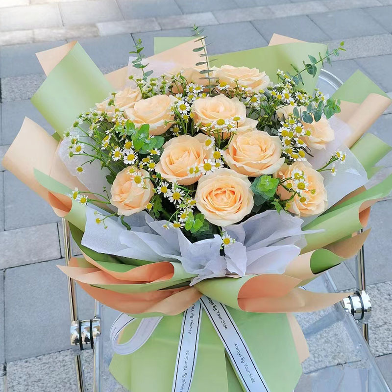 花 材:11朵香槟玫瑰,搭配尤加利叶、洋甘菊(断货则用满天星代替)间插。