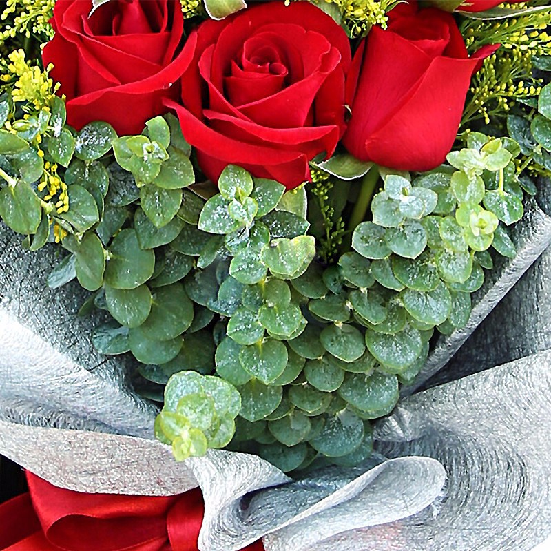 花材: 19支精品红玫瑰,搭配适量黄莺、尤加利。