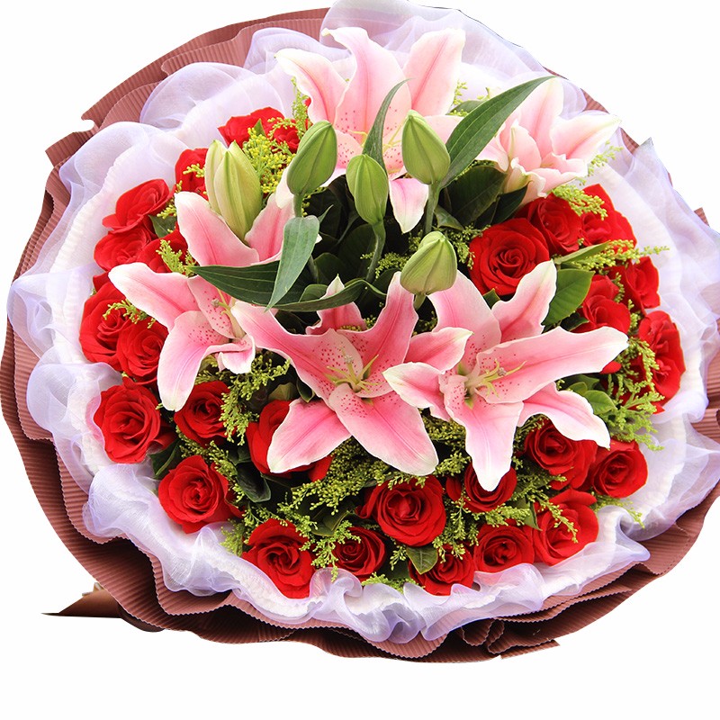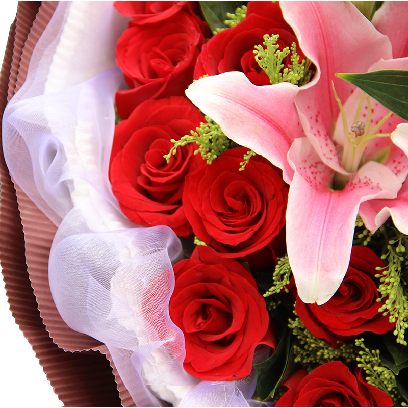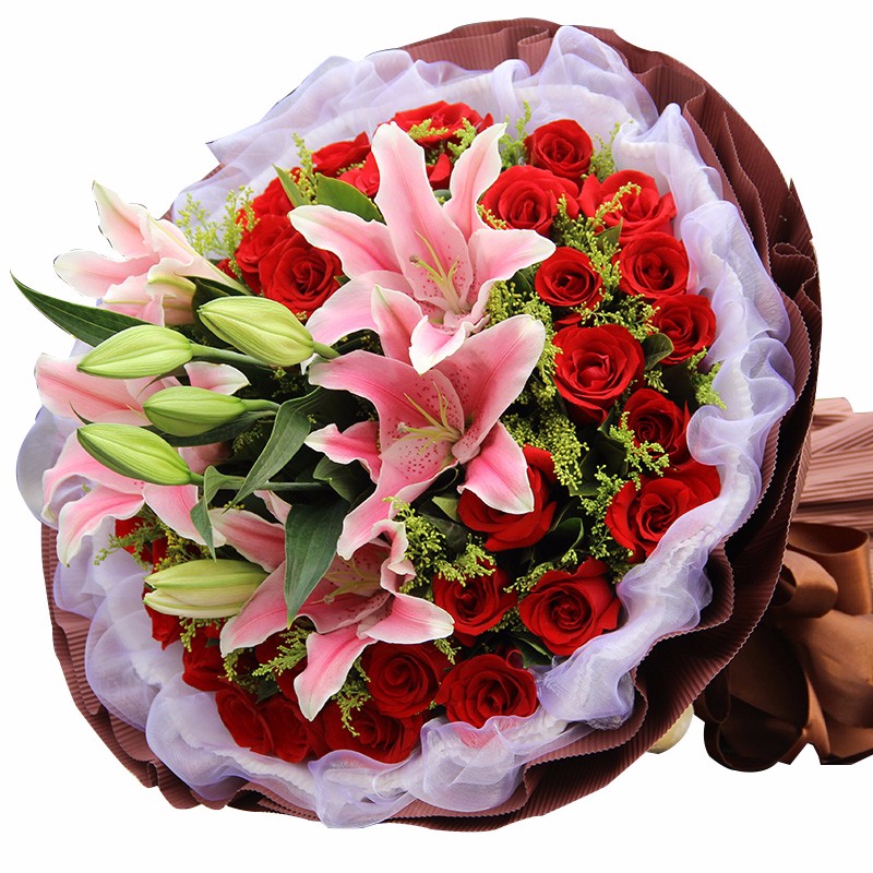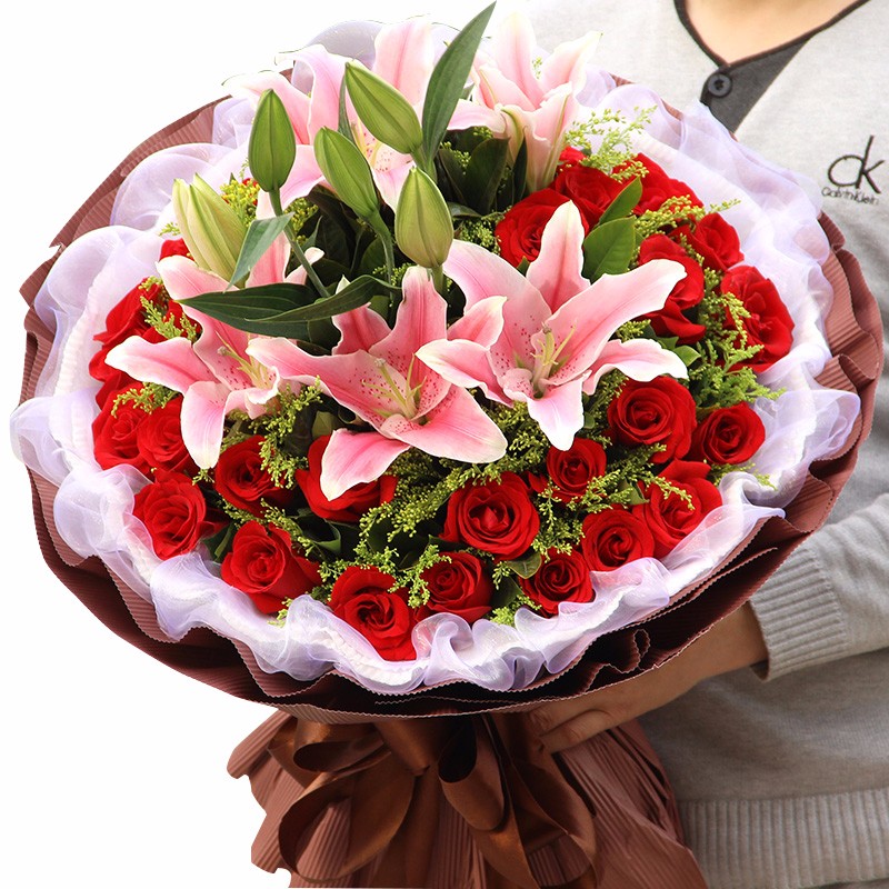 花 材:33支精品红玫瑰、3支多头粉百合,搭配适量黄莺草、栀子叶间插。
