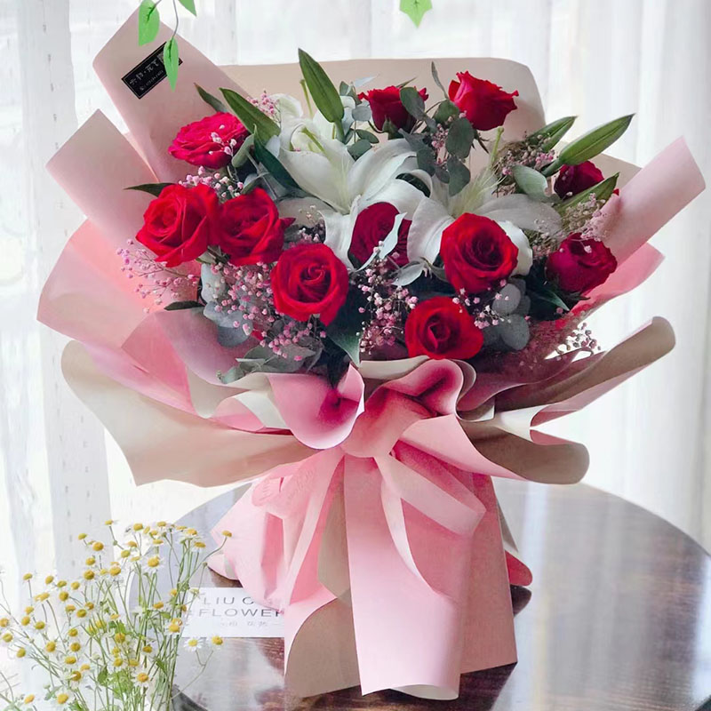 花材: 11朵精品红玫瑰,2支多头白色香水百合,搭配满天星、尤加利叶间插。