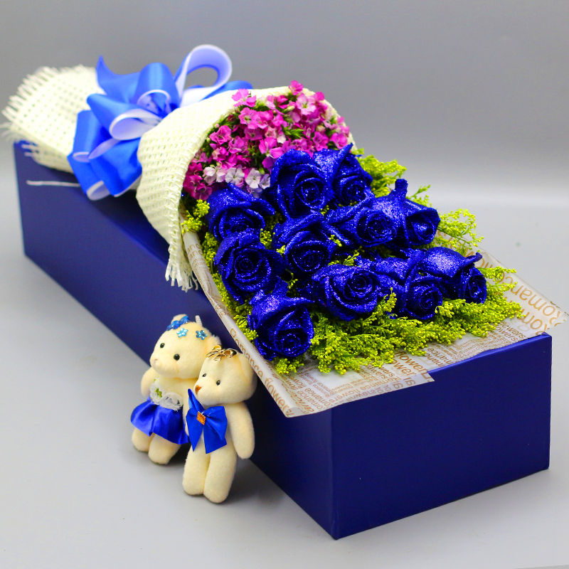 花 材:11枝蓝色妖姬,一对情侣小熊,搭配相思梅、黄莺点缀。