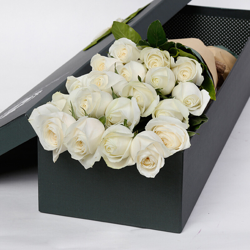 花材: 精选19枝顶级白玫瑰,搭配绿叶点缀。