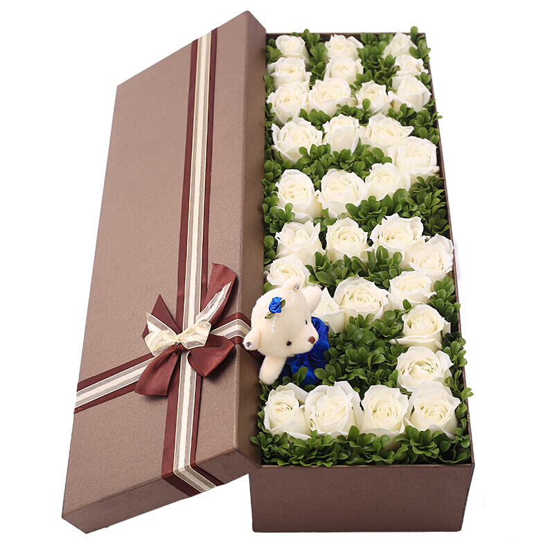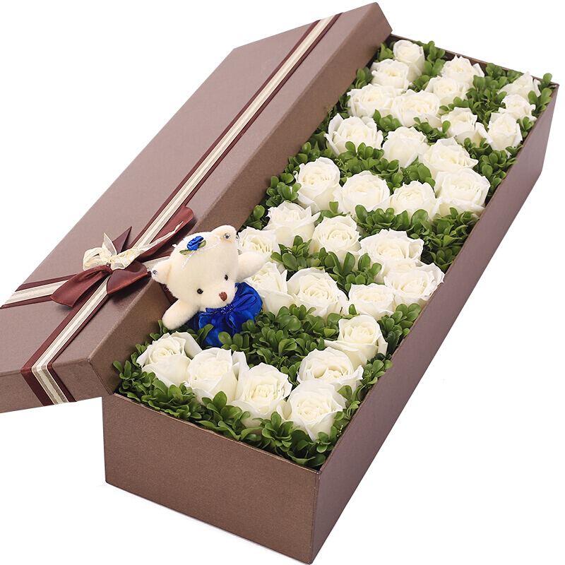 花材: 33朵精品白玫瑰,排列“LOVE”字形,1只小熊,绿叶点缀。