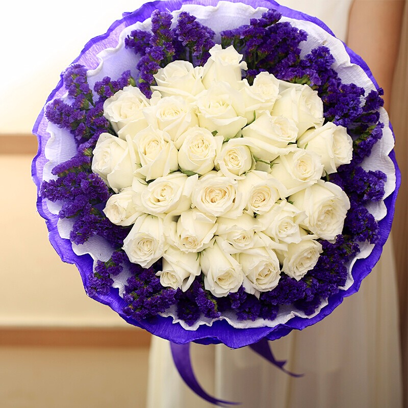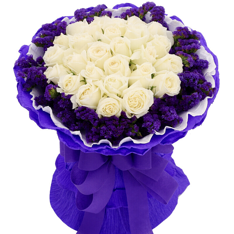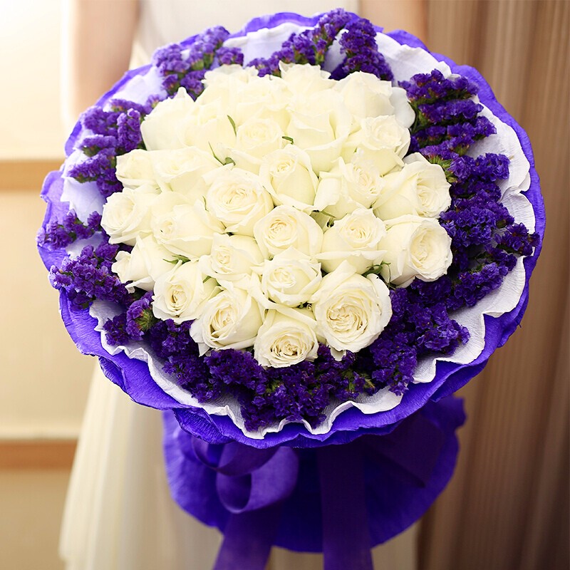 花材: 33朵精品白玫瑰,外围勿忘我丰满点缀。