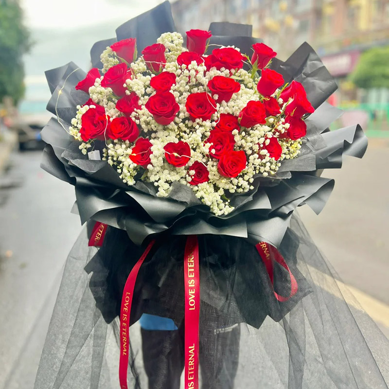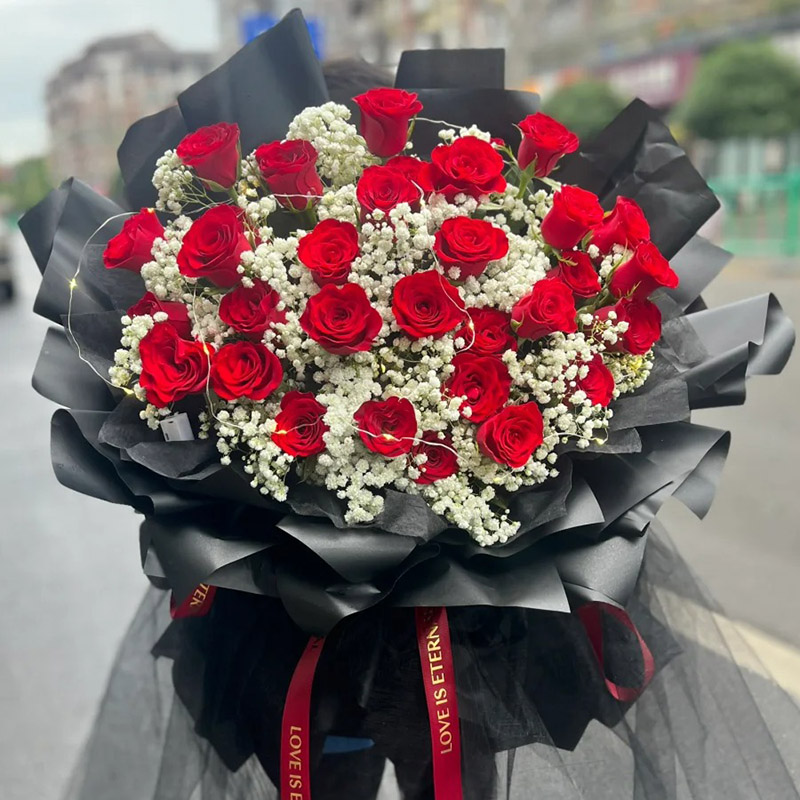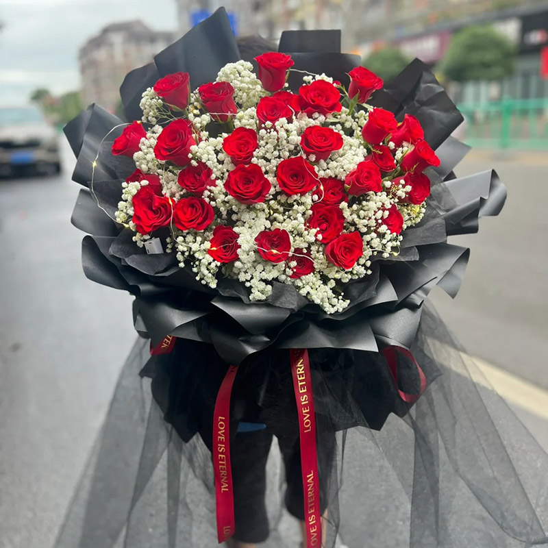 花材: 33朵红玫瑰,1条灯串,满天星、黄莺草丰满间插。