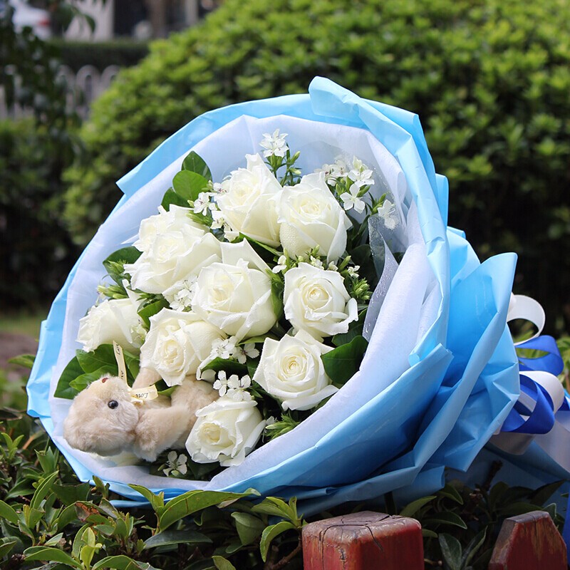包 装:内层白色,外层蓝色手揉纸包成圆形花束,蓝白丝带蝴蝶结。
