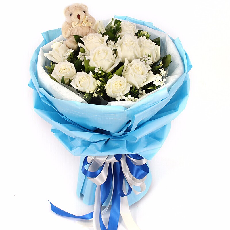 花 材:11朵精品白玫瑰,1只可爱小熊,相思梅点缀。