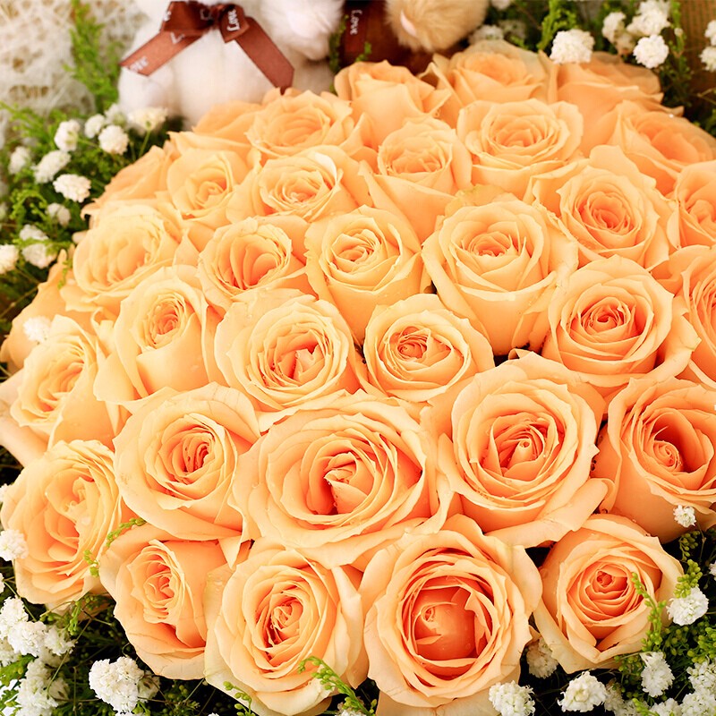 花 材:精选33朵香槟玫瑰,2只可爱公仔,外围满天星、黄莺配花点缀。
