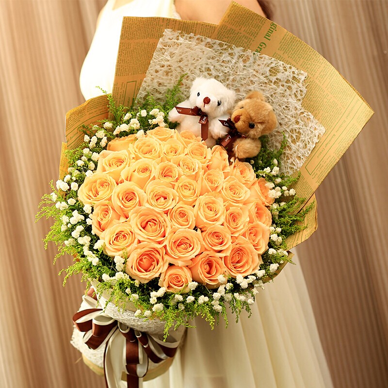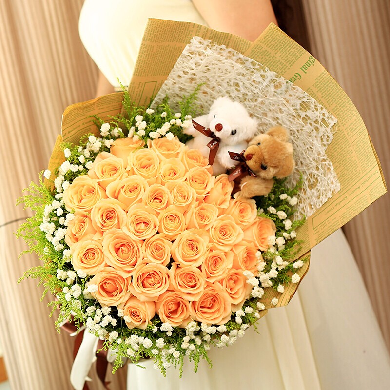 花材: 精选33朵香槟玫瑰,2只可爱公仔,外围满天星、黄莺配花点缀。