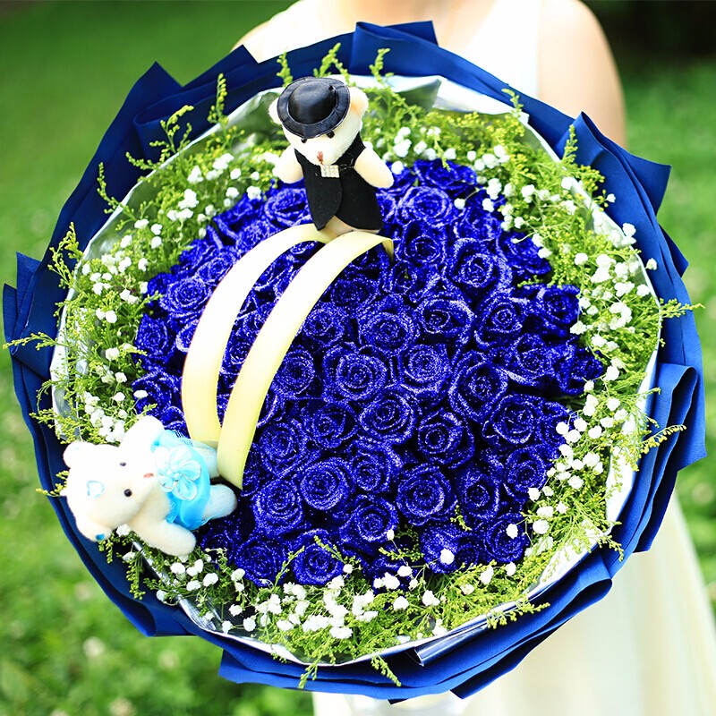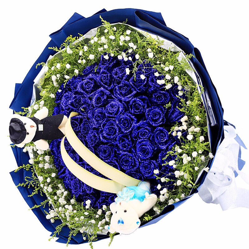 花材: 精心挑选33枝顶级蓝色妖姬,2只可爱公仔,黄莺,满天星外围点缀.