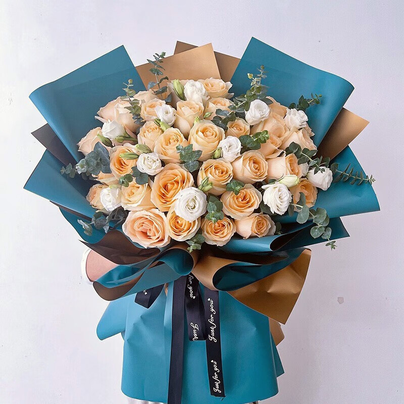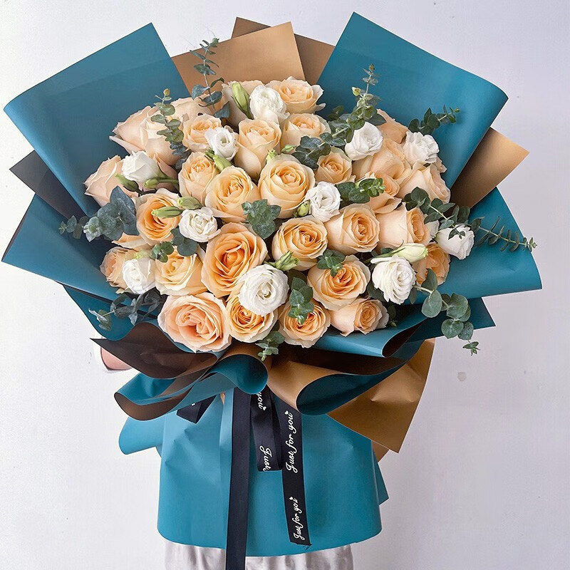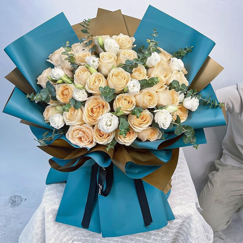 花材: 精选33朵香槟玫瑰,8支洋桔梗(断货则用同数量白玫瑰代替),搭配尤加利叶装饰。
