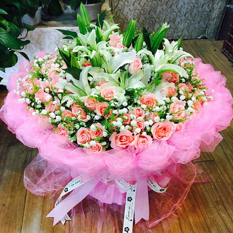 花 材:99朵精品粉玫瑰,21朵百合,满天星、黄莺搭配。