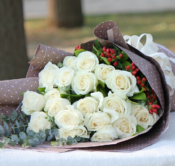 花 材:21朵极品雪山白玫瑰,搭配尤加利叶、红豆、栀子叶装饰。