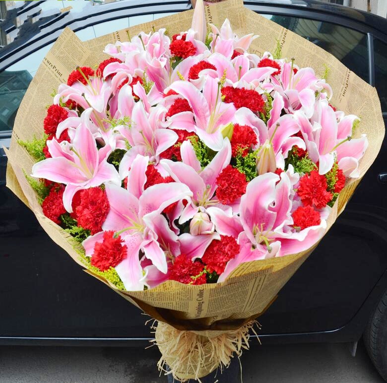 花 材:精选30支红色康乃馨,22朵粉色香水百合,绿叶、黄莺丰满间插。