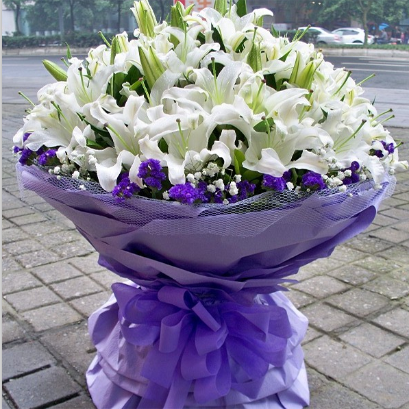 花材: 66朵白色香水百合,绿叶丰满间插,勿忘我、满天星围边点缀。