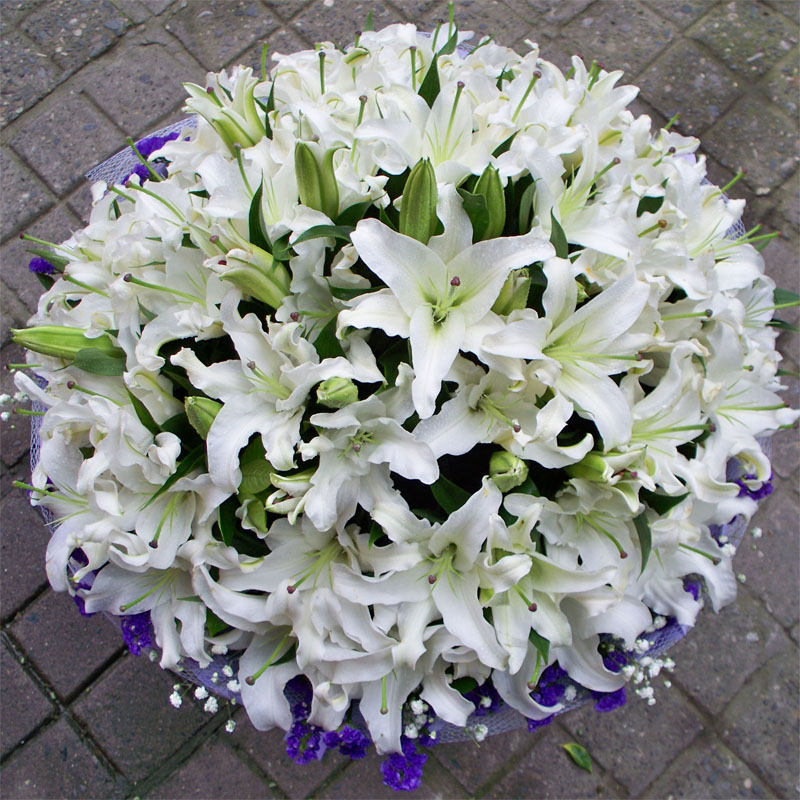 花 材:66朵白色香水百合,绿叶丰满间插,勿忘我、满天星围边点缀。