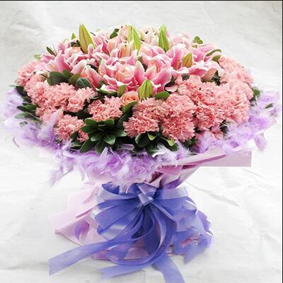 花材: 50枝粉色康乃馨,21朵粉香水百合 , 绿叶丰满间插,紫色羽毛围绕。