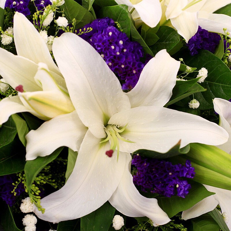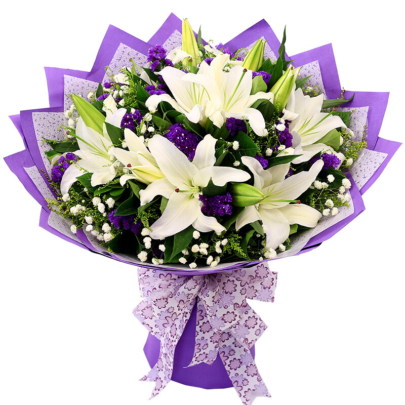 花材: 精选15朵白色香水百合,搭配勿忘我、满天星丰满间插。