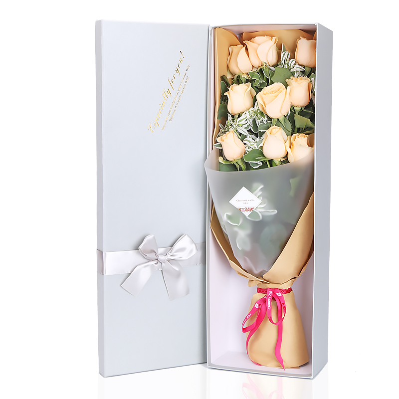 花材: 9支精品香槟玫瑰,搭配适量银边翠间插。