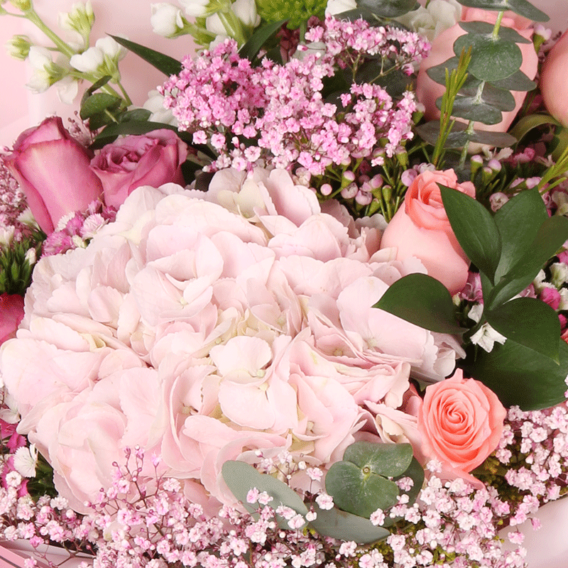 花 材:精选1枝粉色绣球,9枝粉玫瑰,搭配尤加利叶,粉色满天星,绿色小雏菊,绿叶等装饰。