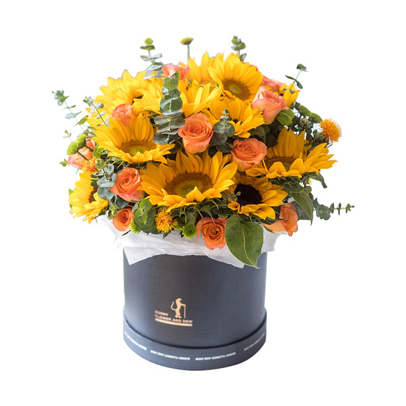花材: 12朵向日葵,11朵金辉玫瑰(或香槟玫瑰),小雏菊,尤加利叶等搭配