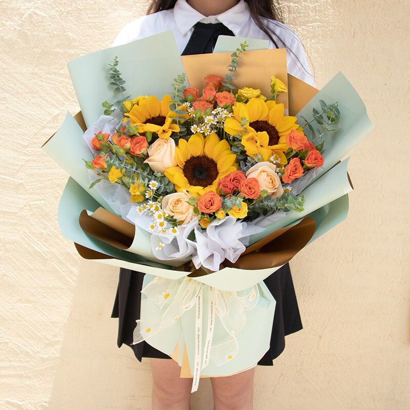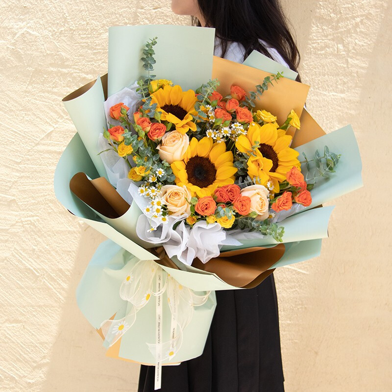 花材: 3朵向日葵,3朵香槟玫瑰,6支多头橙色、黄色混搭小玫瑰,尤加利叶装饰。